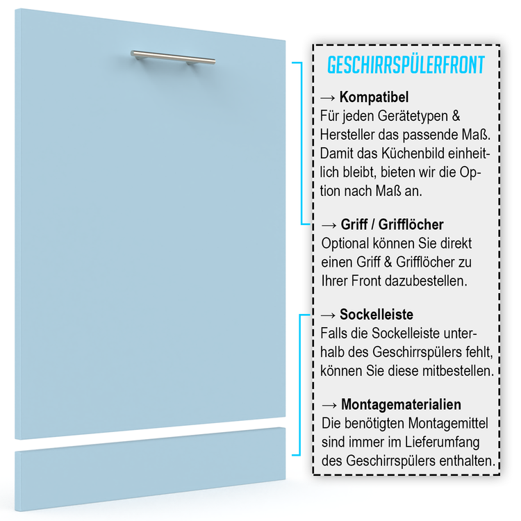 Ist das von Ihnen benötigte Maß nicht dabei, produzieren wir die Geschirrspülerfront ohne zzgl. Kosten nach Ihrem Wunschmaß.